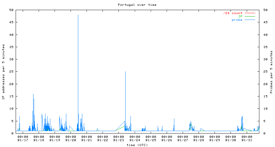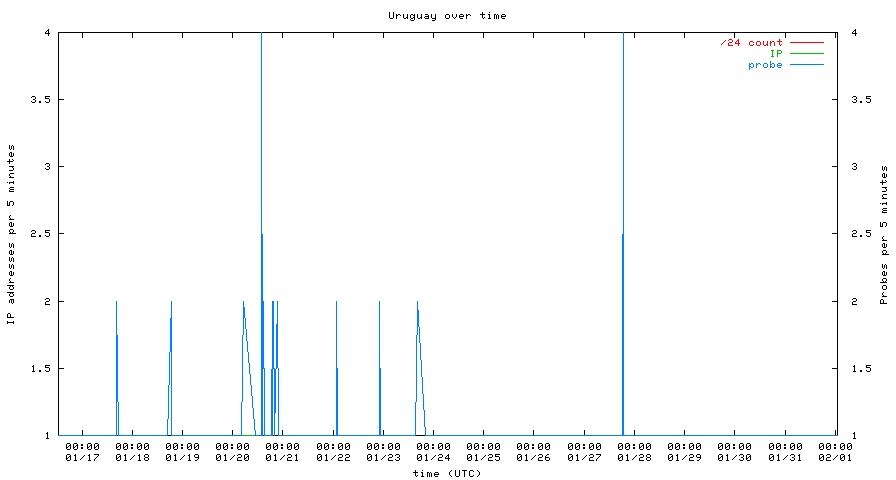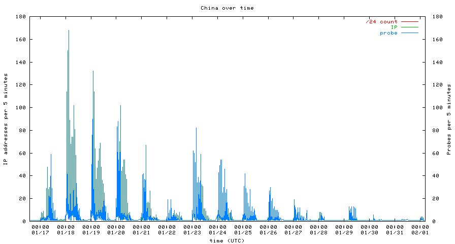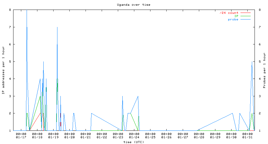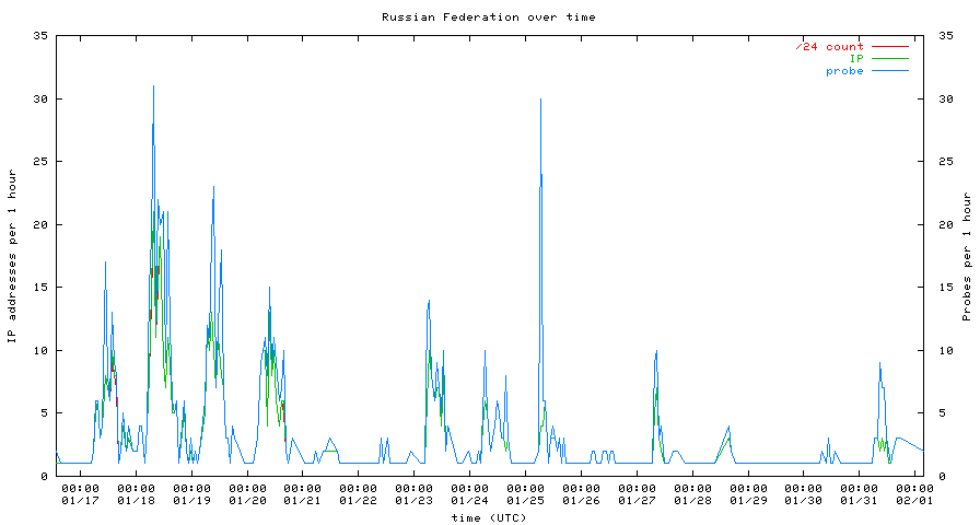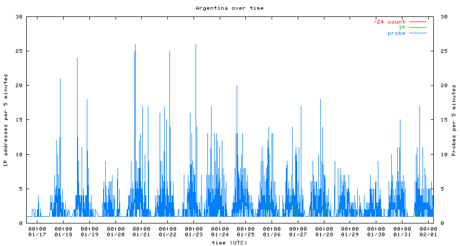 Each graph shows the number of IP addresses, number of probes sent to the web counter, and number of /24 subnets containing an infected computer in that country. Countries with very few infections such that timeseries graphs are not useful and informative have been omitted.