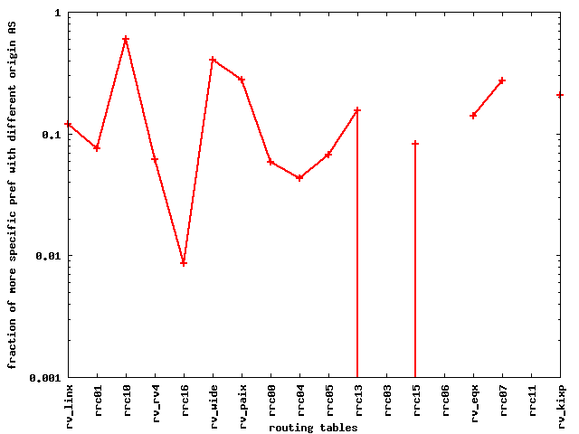 Finally, we study how many of the more specific new prefixes yield a differnt origin AS. We find that for most of the tables, between 10% and 70% of the more specific prefixes actually give a different origin AS.