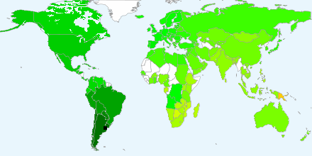 These graphs show the median round-trip times (RTTs) from the probing monitor to various countries (and US states). The country/state is obtained via NetAcuity for each hop's IP address. All RTTs to that country/state are collected and the median is calculated and assigned a color (with a maximum displayed value of 1000ms). The location of the monitor is indicated by a black box on the maps.