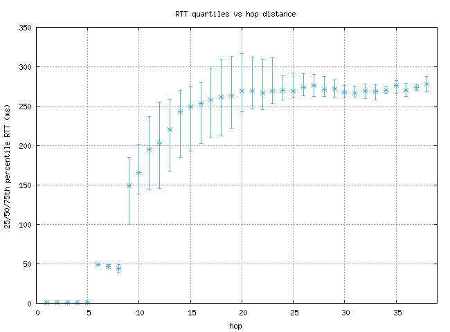 This graph shows the quartiles (25th, 50th, and 75th percentiles) of round-trip times (RTTs) found at each hop in a trace. This includes all probes, even ones that did not reach their destination. The y-axis cuts off values over 450ms, because of the occasional high-RTT result which skews the graph.